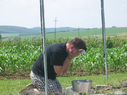 Tenyerével vizet merít a vödörbõl és mosdó mozdulattal arcára simítja.