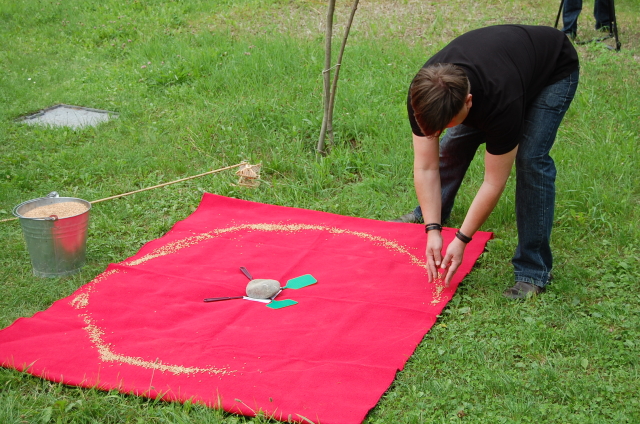 a harmadik többféle , kérő, könyörgő, áldó, óvó, megadó, elutasító, hívó stb., az utolsó pedig minden esetben kinyújtott kar és ökölbe szorított kéz. Közben mindvégig szólt az AYU monoton, kitartott férfihangokból álló zenéje. Aztán elfogyott a tej és amikor megállt a csorgás, a zene is leállt. Akkor Dénes előrébb lépett és egy vödör búzát öntött a korábban használt és a földre letett fedőre és fakanálra. Ismét felvette a madaras botot ám most bekapcsolta a kalitkában lévő kismadarat.