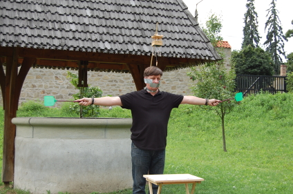 Hosszú botot vett fel, végére madárkalitka volt erősítve, és ezt lassan körbemutatta a közönségnek.